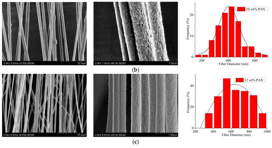 SEM pictures and the according diameter distribution (rightmost) of aligned porous CNFs with different PAN concentrations by MPEM (Average diameter: (a) 8 wt% PAN, 368.8 ± 17.3 nm; (b) 10 wt% PAN 406.4 ± 11.1 nm; (c) 12 wt% PAN 579.9 ± 26.6 nm).
