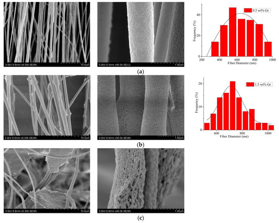 SEM pictures and the according fiber diameter distribution (rightmost) of aligned porous CNFs with different concentrations of Gr by MPEM (Average diameter: (a) 0.5 wt% Gr, 579.9 ± 17.3 nm; (b) 1.5 wt% Gr, 733.1 ± 21.6 nm; (c) 1.5 wt% Gr).