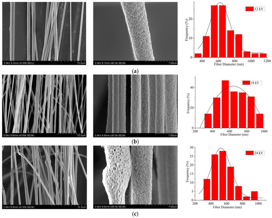 SEM pictures and the according diameter distribution (rightmost) of aligned porous CNFs with different spinning voltages by MPEM (Average diameter: (a) 12 kV, 665.1 ± 31.0 nm; (b) 18 kV,579.9 ± 26.6 nm; (c) 24 kV, 559.1 ± 28.4 nm).