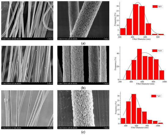 SEM pictures and the according diameter distribution (rightmost) of aligned porous CNFs with different ring voltages by MPEM (Average diameter: (a) 3 kV, 486.2 ± 22.4 nm; (b) 5 kV, 579.9 ± 26.6 nm; (c) 7 kV, 592.1 ± 28.7 nm).