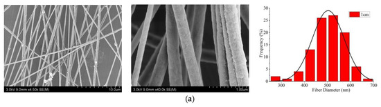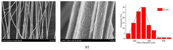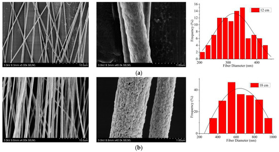 From Figure 9, when the spinning distance was 12 cm, the collected CNFs were distributed widely, the alignment degree of CNFs was 54.2%, and there were no nanopores on the surface of CNFs. When the spinning distance increased to 18 cm, the number of CNFs obtained increased significantly, and nanopores appeared on their surface. The reason was that when the spinning distance increased, the jet movement time increased, and the solvent volatilized sufficiently, resulting in the appearance of nanopores and the increase of diameter. At this time, the alignment degree of CNFs was the highest at 89.5%. When the spinning distance reached 24 cm, the fiber distribution was scattered and sparse, and the alignment degree decreased to 73.2%. This was because as the spinning distance increased, there was not enough electric field force to draft the jet due to the decrease of the electric field strength, leading to the less CNFs received and the inferior alignment degree of CNFs. Therefore, the spinning distance of 18 cm was selected as the optimal spinning distance in the MPEM process.