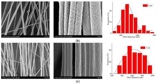 SEM pictures and the according diameter distribution (rightmost) of aligned porous CNFs with different distances of two metal electrodes by MPEM (Average diameter: (a) 1 cm, 503.3 ± 13.4 nm; (b) 3 cm, 504.5 ± 17.8 nm; (c) 5 cm, 510.3 ± 18.1 nm).