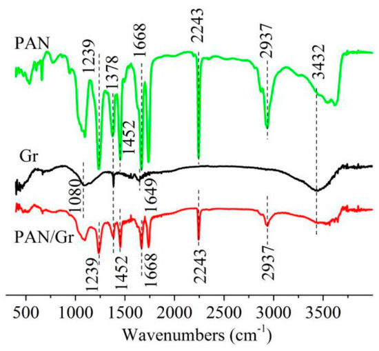 The FTIR spectrum was used to investigate the intermolecular interactions between PAN and Gr. As shown in Figure 11, minor changes in the spectra of the pure PAN nanofiber upon the addition of Gr were found. One of these subtle modifications was observed in the 3300–3500 cm−1 region, indicating that the π electrons present in Gr interact with the hydrogen (free and bonded) attached to the nitrogen in the urethane bond, thus changing the shape of the band, or because Gr used in the experiments might not be restored fully and have hydroxyl on it.