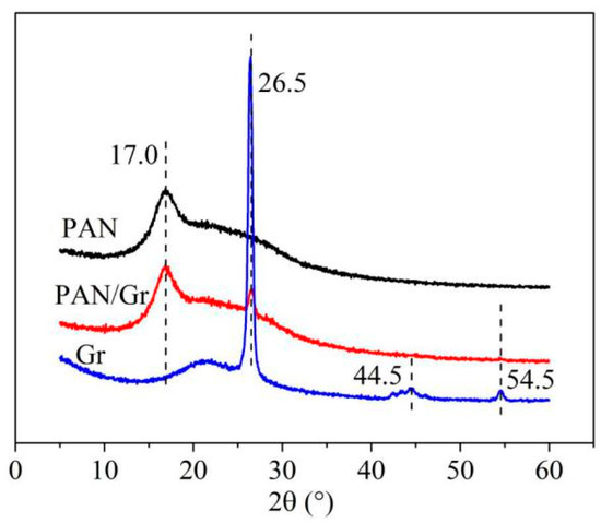 From the spectra results in Figure 12,the sharp peak observed at 2θ = 17° could be assigned as (200) crystal planes of PAN [48]. The peaks at 2θ = 26.5°, 44.5°, 54.5° indicated the typical signal of Gr or graphite structures [49,50]. This peak was associated with the (002) diffraction of the hexagonal graphite structure in the carbon materials. The XRD spectra of PAN/Gr had both typical peaks of PAN and Gr and there were no new crystalline peaks in the PAN/Gr CNFs. Gr and PAN still retained their crystalline structures. The weak peak of the graphene structure at 44.5° did not appear, probably because of the high ratio of PAN composite with respect to Gr.