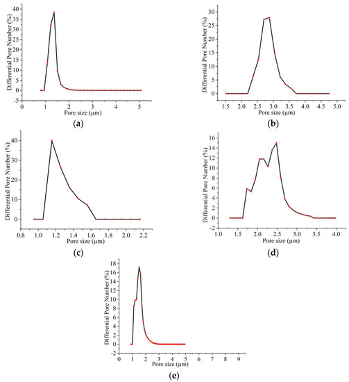 Pore size distributions of CNF membranes: (a) porous CNFs by MPEM; (b) porous CNFs by ES; (c) nonporous CNFs by MPEM; (d) nonporous CNFs by ES; (e) porous PAN NFs by MPEM.