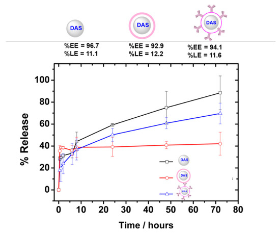 In vitro release studies of the ACNPs showed a sustained release of DAS over 72 h with a negligible burst release compared to non-triggered DAS-loaded NPs. The DAS release from the polymeric NPs was comparable to that reported from polymeric micelles and metal nanoparticles [14,15,16,17]. After PEI coating and subsequent antibody conjugation the nanocarriers achieved more sustained DAS release over time.