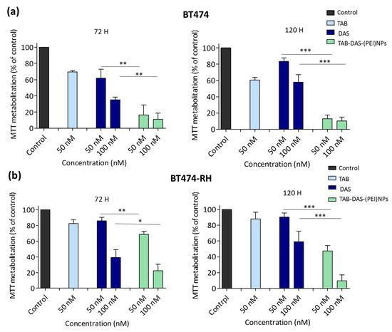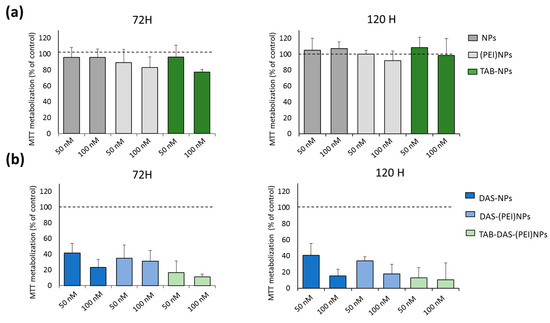 The in vitro cytotoxicity of the formulations was examined by MTT assay in two cell line models, one is BT474, a classic cell line that overexpress HER2, and the second model is BT474–RH, the same cell line but resistant to TAB after being treated with the antibody for a long period of time. The generation of this cell lines was described elsewhere [28]. Both models recapitulate human breast cancer in different clinical situations. BT474 and BT474-RH cells were treated at 50 and 100 nM for 72 and 120 h. Non-loaded NPs (NPs, (PEI)NPs, and TAB-NPs) did not display any significant cytotoxicity in tumoral cells, indicating an appropriate biosecurity profile of the NPs (Figure 4a). An enhanced cytotoxicity of conjugated and non-conjugated DAS-loaded NPs was observed in both cells (Figure 4b). Figure 5 showed an effect of free DAS (IC50~100 nM (72 h)), and TAB-DAS-(PEI)NPs (IC50~50 nM (72 h)) in BT474 and BT474-RH cancer cells. Finally, the administration of TAB-DAS-(PEI)NPs was more active than administration of single agent TAB or DAS at different time points (72 h and 120 h), indicating the efficacy of the vectorized NPs.
