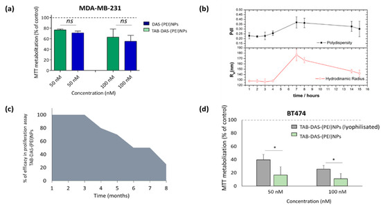 Next, we used the non-over expressing HER2 cell line MDAMB-231 to confirm that the effect was secondary to the binding of the NPs to HER2. Administration of TAB-DAS-(PEI)NPs showed similar MTT inhibition to DAS-(PEI)NPs at two different doses 50 nM and 100 nM after 72 h (Figure 7a). These results demonstrated that conjugation with TAB facilitates the uptake of nanoparticles by targeting cells that overexpress HER2 and had similar effects in those that do not express HER2. The physical stability of TAB-DAS-(PEI)NPs was studied in PBS at different time points. The values of RH and PdI of the TAB-DAS-(PEI)NPs were measured by DLS (Figure 7b). The negligible increase in either particle size or PdI during a 7-day long experiment suggest high stability against aggregation. The antiproliferative activity of TAB-DAS-(PEI)NPs on BT474 were measured by MTTs assays at different times. The TAB-DAS-(PEI)NPs remained active after 3 months of preparation and storage as NPs suspension at 4 °C (Figure 7c). It is important to note for further clinical development that the lyophilization of TAB-DAS-(PEI)NPs decreased cytotoxicity activity of the formulation (Figure 7d).
