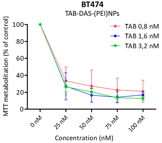 DAR indicates no significant differences of the different cargo over the NPs formulation. BT474 cells were treated with indicated dosis of TAB-DAS-(PEI)NPs with different TAB cargoes (indicated in legend). MTT assays was performed for analysed antiproliferative effect.