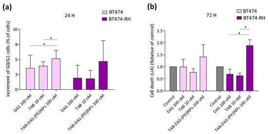To explore whether their mechanism of action was different from free DAS, the two HER2+ cell lines, BT474 and BT474-RH, were treated with TAB-DAS-(PEI)NPs and stained with propidium iodide/RNase solution at 24 h of treatment. DAS blocked the progression through the G1/G0-phase boundary. Administration of TAB-DAS-(PEI)NPs showed a slight increase in G1 compared to the free drug, what confirmed that the NPs mediates their effect in the same manner as DAS in its free formulation (Figure 9a). On the other hand, Figure 9b showed enhanced apoptosis in resistant cells, treated with TAB-DAS-(PEI)NPs in comparison with free DAS and free TAB, which suggests that the resistant cells rely more on this kinase that the naïve ones, a finding in line with previous reports [12].