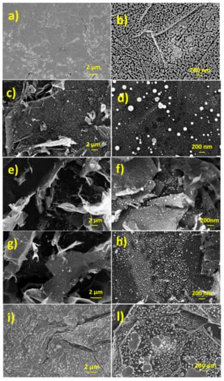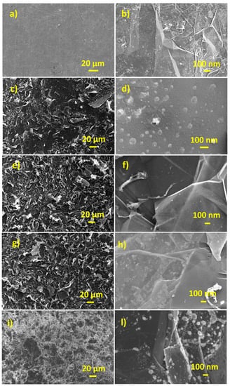 Figure 2 reports typical SEM pictures of pristine graphene paper (a,b) and after laser irradiation at fluence of 0.25 Jcm−2 (c,d), 0.5 Jcm−2 (e,f) and 1.5 Jcm−2 (g,h), respectively. The picture of pristine sample shows the presence of flat layers differently oriented on the plane. In addition, defects consisting of cracks and voids are present. The laser irradiation induces the graphene paper exfoliation, visible by the presence of numerous nanosheets. Moreover, some bright spots with a size of about 50 nm can be observed. These spots can be ascribed to the presence in some regions of surface blistering. No significant differences have been found within the explored fluence values. Thermal treatment at 400 °C of graphene paper does not produces significant modifications of the morphology (Figure 2i,l).