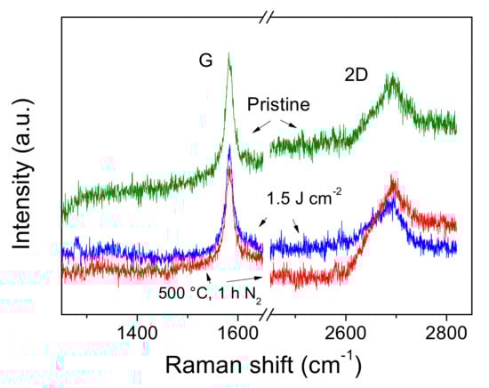 Figure 3 reports typical micro Raman spectra of untreated (pristine) and laser irradiated graphene paper at fluence of 1.5 Jcm−2. The spectrum of untreated sample shows a first order peak centered at 1581.4 cm−1, assigned to G-peak, and a second order broad signal centered at about 2689.9 cm−1, which is assigned to 2D-peak. The spectra of thermally treated samples in the range of 300–500 °C and laser treated samples in the range of fluence 0.25–1.5 Jcm−2 show similar signals. Figure 3 reports the spectra corresponding to the most severe stress conditions studied, i.e., 1.5 Jcm−2 e 500 °C. Therefore, the above corresponding assignments valid for pristine sample can be still applied for the treated samples. Basing on the Raman characterization, we excluded the presence of significant structural disorder of the substrate in the explored conditions []. XRD patterns of both pristine and laser irradiated samples (data not shown) are characterized by only one peak at 2ϑ = 26.54°. This signal represents the main graphite contribution (symmetric group P63/mmc) assigned to the (0002) crystallographic planes. Accordingly, graphene paper substrates consist of multiple layers of graphene sheets, with a high degree of structural order.