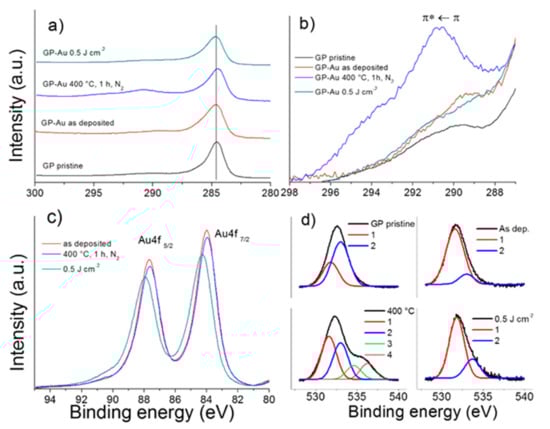 (color online) (a) XPS C1s core-level spectra of pristine GP and GP-Au as deposited and after 400 °C thermal dewetting and 0.5 Jcm−2 laser dewetting. The vertical line has the function to facilitate visualization. (b) enlarged spectral regions showing the satellite structure normalized to the C1s peak, after linear background subtraction; (c) corresponding Au4f spectra; (d) corresponding O1s spectra.