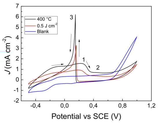 The electro-catalytic activity of the GP-AuNPs sensors was studied by cyclic voltammetry. Figure 7 reports the voltammograms obtained by the 400 °C thermal and 0.5 Jcm−2 laser dewetted sensors. Both voltammograms in the forward scan shows two broad peaks at 0.25 V (1) and 0.45 V (2), respectively. The peak at 0.25 V is assigned to the formation of gold hydroxide and the adsorbed glucose intermediate is oxidized to gluconolactone. At more positive potentials, we found the weak peak at 0.45 V which is assigned to the oxidation of the gold hydroxide layer, that became oxidized to gold oxide. At this stage the glucose oxidation is inhibited. In the backward scan, the gold oxide was reduced to gold hydroxide, which electro-catalyzes the glucose oxidation through the two electron process. This process is evidenced by the intense and sharp anodic peak (3) observed at 0.17 V for the laser dewetted and at 0.15 V for the 400 °C thermal dewetted sensor, respectively. According to the XPS data, the observed shift could be attributed to the different chemical state of gold found in the two sensors.