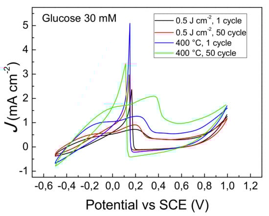 Quasi-linear current response was obtained by both type of electrodes in the concentration range from 20 µM–8 mM. Conversely, a nonlinear response was observed in the range of concentration 8–30 mM. The absence of linearity in latter concentration range is caused by the diffusion controlled mechanism that limits the concentration of glucose on the sensor surface. Sensitivities of 1240 µA mM−1 cm−2, and of 675 µA mM−1 cm−2 were obtained in the concentration range of 2–4 mM by the 300 °C thermal and 0.5 Jcm−2 laser dewetted electrodes, respectively. A detection limit of 2.5 μM and quantification limit of 20 μM were obtained. The data are competitive with respect to the state of the art of recent literature results concerning various non-enzymatic/enzymatic hybrid and gold-based nanostructures for glucose biosensors [,,,,,]. The interference of the common species such as ascorbic acid and uric acid was studied and the details were reported elsewhere []. The observed interference effects are mainly attributed to the adsorption of UA that dirty the electrode surface.