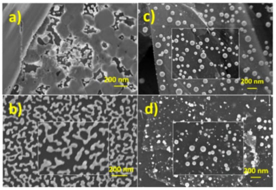 For comparison, we studied the effects of the thermal dewetting. Figure 5i,l shows typical SEM pictures of graphene-gold nanostructures obtained by thermal dewetting at 400 °C. We observed that dewetting conditions in the temperature range of 300–500 °C gave similar gold nanostructures. Typical gold faceted nanostructures characterized by wide distribution in the range 200–400 nm where observed. Accordingly, the main difference in the morphology exhibited by the thermal and laser dewetting processes consist in the size distribution and shape of the resulting nanoparticles []. Nanosecond laser dewetting induces an increase of temperature that, depending on pulse power and duration, heat loss and substrate thermal diffusivity, can reach 2000 K []. This temperature is above the gold melting point (1337.33 K) [], thus the obtained nanoparticles are almost spherical. Below the melting point, dewetting of gold on graphene paper occurs at solid state to minimize the total surface free energy, since the system is thermodynamically unstable at elevated temperature.