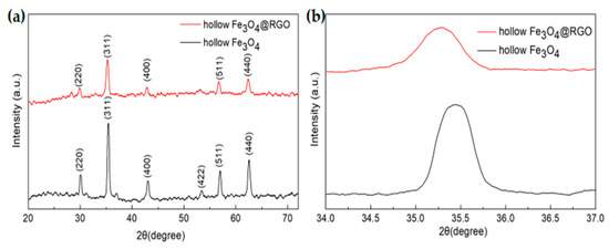 For the sake of clarification, the XRD patterns of hollow Fe3O4 and hollow Fe3O4@RGO are illustrated in Figure 2. As could be observed, the typical peaks at 29.9°, 35.5°, 42.9°, 53.1°, 56.8°, and 62.5° could be readily indexed to the (220), (311), (400), (422), (511), and (440) planes of hollow Fe3O4; moreover, the face-centered cubic phase structure (JCPDS no. 89-2355) could also be seen [30]. Obviously, all peaks in the hollow Fe3O4@RGO curve are slightly weaker than those in the hollow Fe3O4 curve, which could be ascribed to the graphene content in the composites. In addition, the (311) peak of hollow Fe3O4@RGO shifted toward the lower angle of 35.3°, which is in contrast to that of the hollow Fe3O4 shown in the magnified picture of XRD patterns in Figure 2b.