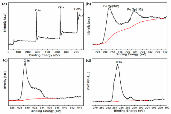 To confirm the phases and structures of the hollow Fe3O4@RGO composites, XPS spectra were measured. Elements, including C, O, and Fe were found to be correlated with various atom contents, as illustrated by the large energy range spectrum (Figure 3a). In Figure 3b, the high-resolution spectrum of Fe could be deconvoluted into two peaks, related to Fe 2p3/2 and Fe 2p1/2, which correspond to the band energies of 710.9 eV and 724.3 eV, respectively, indicating that the mixing ratio of oxides of Fe (II) and Fe (III) is consistent with the reported value of Fe3O4 [31]. Figure 3c shows the O1s peaks at 529.1 eV and 532.1 eV, which could be attributed to the O element in Fe3O4 and RGO, respectively [32]. Moreover, the C1s peak (Figure 3d) at 285.1 eV could be attributed to the C element in RGO. Hence, the composites are suggested to be composed of Fe3O4 and RGO, revealing that hollow Fe3O4 was successfully grown on the RGO multilayer.