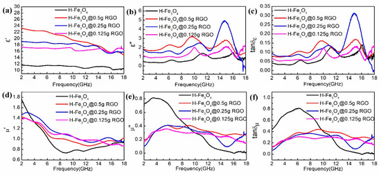 As can be observed from Figure 5a,b, the ε’ and ε” values of the hollow Fe3O4@RGO composites are higher than those of the hollow Fe3O4, owing to the addition of dielectric loss materials, which is particularly true for the hollow Fe3O4@0.5 g RGO composites. In detail, the ε’ values show a declining trend versus the changing frequency, whereas the ε” values exhibit a fluctuant variation trend, since the variation peaks appear at 6.5, 10, and 15 GHz across the whole range. Moreover, the permittivity curves indicate that the dielectric properties of the hollow Fe3O4 are greatly improved with the addition of RGO. Figure 5d,e show the μ’ and μ” values of the samples, among which the μ’ value presents a declining trend. Specifically, the μ’ value of the hollow Fe3O4 decreases dramatically in the range of 2–8 GHz, which is less than that of the hollow Fe3O4@RGO at the range of 4–18 GHz. Besides, the μ” values remain almost constant with the change in RGO concentration, except for the hollow Fe3O4. Figure 5c,f present the dielectric loss tangent and magnetic loss tangent of the samples, respectively. Notably, the dielectric loss tangent is less than 0.15, except for the hollow Fe3O4@0.25 g RGO in the range of 13–17 GHz, while the magnetic loss is mostly above 0.2. Obviously, the hollow Fe3O4@RGO composites possess a higher tanδμ at 2–18 GHz, which indicates that the magnetic loss contributes to the electromagnetic microwave absorption.