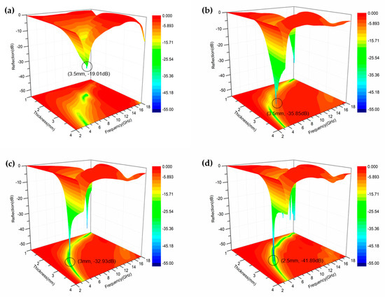 Three-dimensional (3D) presentations of reflection loss of the hollow Fe3O4 composite (a), hollow Fe3O4@0.5 g RGO composite (b), hollow Fe3O4@0.25 g RGO composite (c), and hollow Fe3O4@0.125 g RGO composite (d) at different thicknesses.