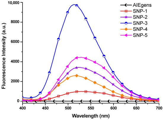 Fluorescence spectra of AIEgens in THF (concentration: 1 × 10−3 mol/L) and fluorescent HNPs with spindle shape (SNP) dispersed in water (concentration: 200 μg/mL). Excitation wavelength: 360 nm. SNP samples were prepared according to the reaction conditions listed in Table 1.