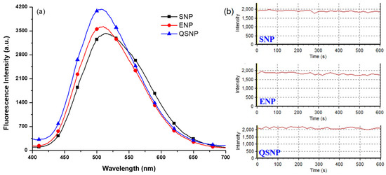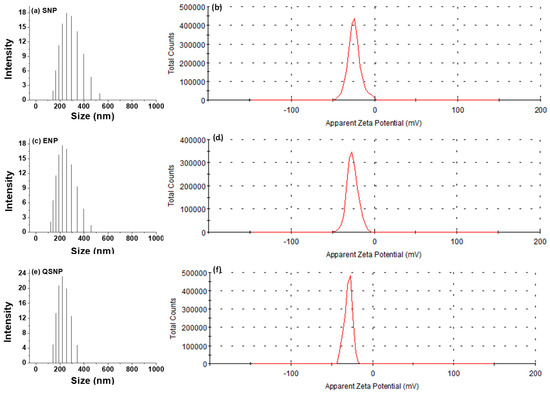 Dynamic light scattering measurements were performed to determine the hydrodynamic diameters and Zeta potentials of the resultant fluorescent HNPs. As shown in Figure 5 and Table 2, average hydrodynamic diameters for three samples were 258 nm for SNP, 221 nm for ENP, and 217 nm for QSNP, with the corresponding narrow polydispersity index (PDI) of 0.075, 0.074, and 0.01, respectively. Further, colloidal stability is an important and fundamental parameter for NPs for their various applications, which can be evaluated by surface charges or zeta potential [45]. From Figure 5b,d,f and Table 2, the zeta potentials of three fluorescent HNPs with different shapes were −24.3 mV for SNP, −26.1 mV for ENP, and −29.6 mV for QSNP, respectively. The zeta potentials of three samples in other mediums containing fetal bovine serum (FBS) were determined according to the similar method (Table S1 and Figure S4). These results implied good stabilities of three samples in a physiological environment.