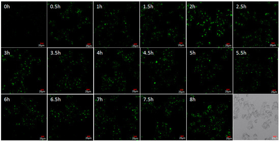 Three fluorescent HNPs with different shapes, i.e., SNP, ENP, and QSNP were co-cultured with Hela cells for various times to preliminarily explore the influence of their morphologies on the interaction with cells. In this experiment, 2 mL of sample with the concentration of 10 μg/mL in cell culture medium was added to the Hela cells and incubated for various times at 37 °C. After washing the cells with PBS buffer, the cells were directly observed by CLSM. Figure 8, Figure 9 and Figure 10 show the representative CLSM images of SNP, ENP, and QSNP at different times, respectively. From Figure 8, Figure 9 and Figure 10, three samples could be gradually taken in the cytoplasm with the extension of incubation time, but, time-dependent cell uptake behaviors for three samples were significantly different (Figure 11). The average optical density (IOD/area) values were extracted from CLSM images based on 20 cells by Image-J. From Figure 11, the IOD/area values for three samples were gradually increasing at the beginning, reaching the maximum, then dropping until to a certain value which was possibly due to the fluorescent nanoparticles being excluded from cellular internalization altogether when the size of any particle exceeded 150 nm [47,48]. The larger amount ENP seemed be taken into cells at a similar rate compared to that of SNP since they had approximate fluorescence quantum yield (Φ) (Table 2). The IOD/area of ENP sample reached a maximum after incubation with Hela cells for 2 h. This result was consistent with the case of ellipsoidal mesoporous silica NPs with an aspect ratio of 1.51–2.39 reported in the literature [10]. In the case of QSNP, the IOD/area peak was reached when the incubation time was extended to 6 h, implying its lowest cellular uptake rate under the same conditions compared to those of the other two tested samples with different shapes.