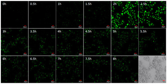 CLSM images of HeLa cells after incubation with SNP (10 μg/mL) for different times. The last one is the bright field image of HeLa cells, corresponding to CLSM images with incubation time of 2 h.