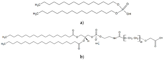 Molecular structure of ligands used for superparamagnetic iron oxide nanoparticles (SPIONs) functionalization. (a) dihexadecyl phosphate (DHP); (b) 1,2-distearoyl-sn-glycero-3-phosphoethanolamine-N-[carboxy-(polyethylene glycol)-2000] (PL-PEG-COOH).