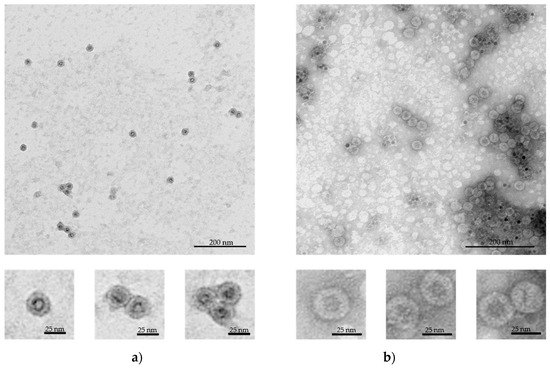 Transmission electron microscopy (TEM) images of the assembled VLPs with magnetic cores, negatively stained with 2% uranyl acetate. (a) SPION-DHP-HBc VLPs obtained at 0.2 mg/mL of SPION-DHP and 0.05 mg/mL of HBc; (b) SPION-PEG-HBc VLPs obtained at 0.05 mg/mL of SPION-PEG and 0.05 mg/mL of HBcAg.