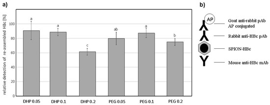 (a) HBc re-assembly on SPIONs functionalized with DHP or PEG in different concentrations (mg/mL) in comparison to the initial preparation of plant-derived antigen (100%). Statistically significant differences marked by a letter indexes; (b) Scheme of enzyme-linked immunosorbent assay (ELISA) test used for assay of VLP-assembled HBc and SPION-HBc VLPs. AP—alkaline phosphatase.