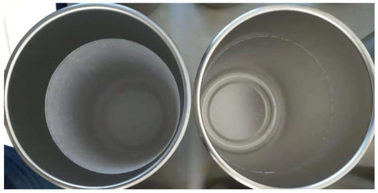 The image of the CaCO3 scales attached to the experimental cup in the absence of an inhibitor (left) and in the presence of 100 mg/L carbon nanoparticles (right).