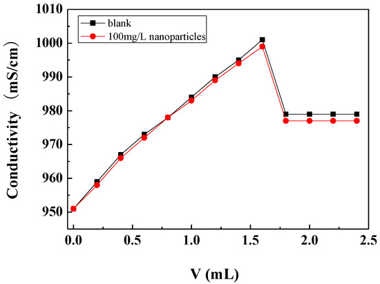 Figure 6 shows the conductivity changes with the addition of the Na2CO3 solution in the scale-forming solution containing carbon nanoparticles and in the blank. It can be seen that the critical conductivity value of the scale-forming solution did not change obviously after the addition of the carbon nanoparticles. Therefore, the addition of carbon nanoparticles hardly changed the critical point of calcium carbonate crystallization, that is, carbon nanoparticles did not change the supersaturation of calcium carbonate in solution. The results are consistent with the residual calcium ion concentration measurement results shown in Section 3.3.1.
