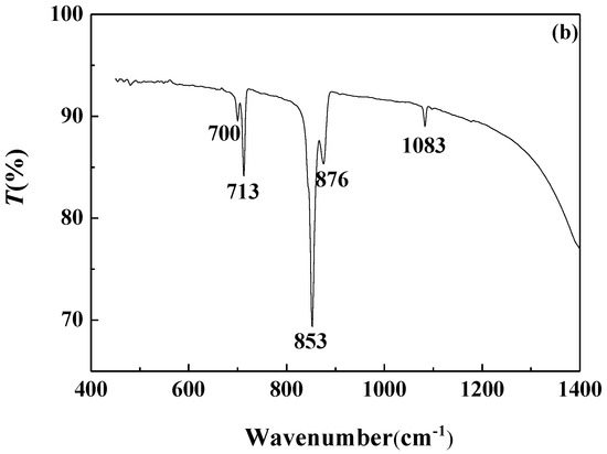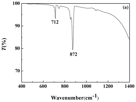 FTIR analysis of the calcium carbonate crystals prepared in the blank scale-forming solution and the scale-forming solution containing 100 mg/L carbon nanoparticles were carried out and the results are shown in Figure 8. The calcium carbonate crystals formed in the blank had the characteristic absorption peak of calcite at wavelengths of 712 cm−1 and 872 cm−1, which corresponds to the deformation vibration of the O–C–O surface and the deformation vibration of the surface, respectively [40]. For the calcium carbonate crystals formed in the solution containing carbon nanoparticles, the absorption peaks of calcite at wavelengths of 712 cm−1 and 872 cm−1 almost disappeared, and the characteristic absorption peaks of aragonites at 700 cm−1, 713 cm−1, and 853 cm−1, as well as a small absorption peak of vaterite at 1083 cm−1, were seen [41].