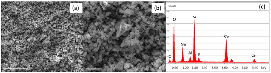 Figure 1 shows the morphology (a, b) and the compositional analysis (c) of SBA2 glass powders. The powders display the typical sharp-cornered morphology of ball-milled glass. Moreover, as previously mentioned, the majority of SBA2 powders showed a grain size < 5 µm. In addition, the performed DTA analysis evidenced a glass transition temperature of about 550 °C, the crystallization onset at 600 °C, a crystallization peak at 655 °C and a melting temperature of 1220 °C.