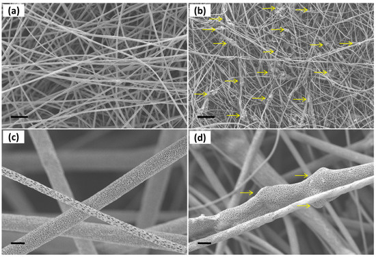 SEM micrographs of (a) neat polylactic acid (PLLA) fibres and (b) PLLA-SBA2 fibres (scale bar = 25 µm). Neat PLLA fibres (c) and composite fibres (d) at high magnification, evidencing their highly porous surface. Scale bar: 2 µm.