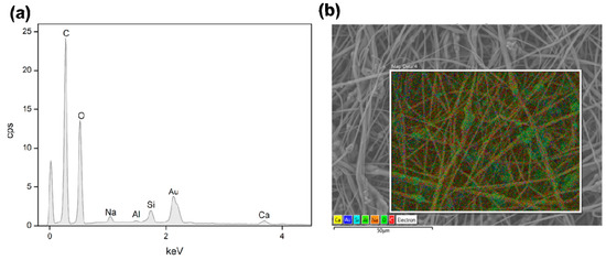 EDS spectrum of electrospun PLLA-SBA2 fibres (a) and its comparative SEM-EDS layered image (b) showing peaks of SBA2 constituents such as Ca (yellow), Na (orange) and Si (cyan). O (bright green) and C (red) are mainly related to PLLA.