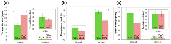 The mechanical properties of the polymeric and composite fibres mats, determined from their stress–strain curves, are summarized in Figure 4, in terms of Young’s modulus (Figure 4a), elongation at break (Figure 4b) and tensile strength (Figure 4c) for either randomly oriented and aligned electrospun samples. Particularly, in uniaxially aligned arrays, in which the fibres and to some extent polymeric chains [47,48,49,50,51] are oriented along the traction axis, mechanical differences between composite and neat PLLA are more pronounced [49]. The elastic modulus of PLLA-SBA2 fibres is found to be (34 ± 5) MPa, significantly higher than the value measured for pristine PLLA fibres, (20 ± 2) MPa, just for the aligned fibres. Correspondingly, PLLA-SBA2 exhibits a relatively lower elongation at break (15 ± 2%) compared to the value of PLLA samples in the same alignment conditions (20 ± 2%), as well as higher tensile strength (11 ± 1 MPa), compared to (7 ± 1) MPa. The mechanical behaviour of the composites tightly depends on the interaction at the polymer-bioactive glass interface and on the homogeneity of the dispersion of glass particles in the fibres, which if poor would lead to agglomeration in clusters [51]. The present findings in terms of increased elasticity and concomitant reduction of the elongation at break and tensile strength are indicative of a reinforced fibre system where inorganic fillers lead to embrittlement of the fibres [39,52].