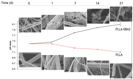 In vitro degradation studies and dissolution of PLLA and PLLA-SBA2 electrospun fibres. Change in the pH of DPBS solution for PLLA and PLLA-SBA2 fibres, which is associated to the acid hydrolysis of the polymer components and to the release of SBA2 into the solutions at 0, 1, 7, 14, 21 days from incubation and the relatives SEM micrographs at high magnification of composite and polymeric fibres along soaking experiments in SBF at the same time point (scale bar = 2 µm).