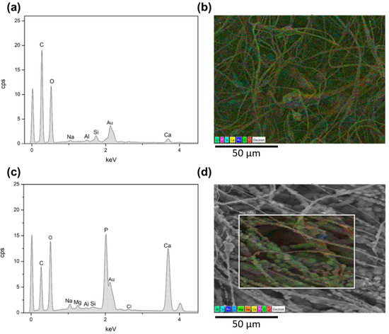 EDS analysis of PLLA-SBA2 samples after 7 days (a,b) and 21 days (c,d) of soaking in SBF. EDS spectra of PLLA-SBA2 (a,c) and comparative EDS layered images (b,d) reveal an increment of Ca (yellow) and P (purple) content. SBA2 constituents: Na (orange), Al (green) and Si (cyan). O (bright green) and C (red) mainly relate to PLLA.