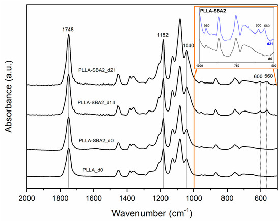 Fourier transform infrared (FTIR) spectra of neat PLLA (PLLA_d0) and composite scaffolds (PLLA-SBA2_d0) before incubation in simulated body fluid (SBF) and of composite fibres after 14 (PLLA-SBA2_d14) and 21 days (PLLA-SBA2_d21) of incubation in SBF. The inset better highlights the new peaks ascribable to hydroxycarbonate apatite (HCA) formation mentioned in the text.