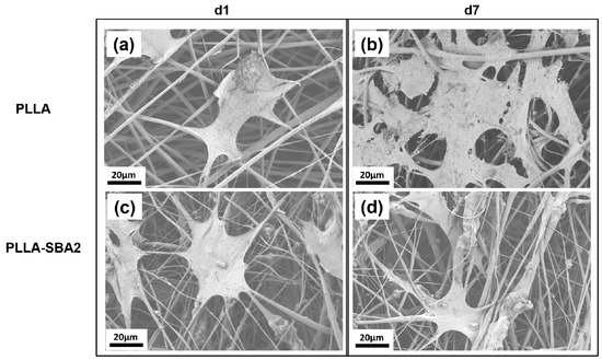 At day 7 after seeding the values of absorbance measured on PLLA fibres and on PLLA-SBA2 fibres become comparable, as shown in Figure 10, evidencing that the initial conditions of pH changes do not affect cell viability at longer timescales. ST2 cells cultured on composite fibres generally exhibit a relatively lower cell density following seeding, then reaching cell densities comparable to those on PLLA fibres after 7 days. Indeed, despite a significant difference in cell density immediately after cell seeding, these results evidence the ability of PLLA-SBA2 fibres to providing an effective and viable environment for subsequent scaffold colonization.