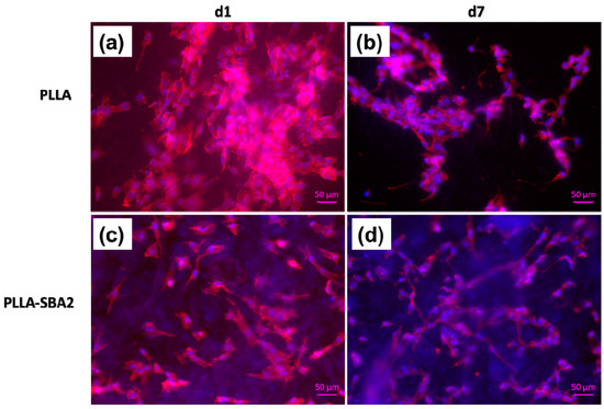 Fluorescent labelled actin filaments (red) and nuclei (blue) in ST2 cells cultured on neat PLLA (a,b) and PLLA-SBA2 (c,d) fibres, after 1 day (a,c) and 7 days from cell seeding. Scale bar: 50 μm.