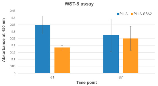 WST-8 assay: histograms of absorbance at 450 nm for PLLA and PLLA-SBA2, one (d1) and seven (d7) days after the seeding.