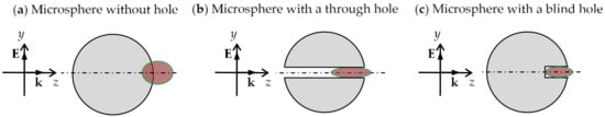 This section describes the nanohole-structured microspheres with a sphere diameter of Ds = 3.5λ and a refractive index of n = 1.5, which were simulated and analyzed. To make the structure clear, schematic diagrams for the simulated microspheres with a through hole and a blind hole are depicted in Figure 1b,c, respectively.