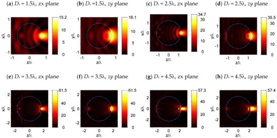 After this, dielectric microspheres with a blind hole at the shadow surface were also simulated and the results are shown in Figure 4. In the simulation, the hole diameters were set to be dh = λ/5, λ/10, and λ/40, respectively, with a hole depth of 3dh. The corner radius at the opening of the hole, as well as the fillet radius at the blind end of the hole, were both set to be r = dh/2. From Figure 4a,b, we can see that for a sphere with a hole size of dh = λ/5, the focusing capability of the sphere is weakened by the hole, compared to a sphere without a hole in Figure 1e,f. When the hole sizes are decreased below λ/10, the focused light spot was mainly confined to the blind hole, as shown in Figure 4c–h. “Hot spots” can be observed in Figure 4e,h, which were located inside the hole and near the opening of the hole in the polarization plane (z–y plane), as indicated by the contour lines at the value of 0.85Imax and 0.9Imax.