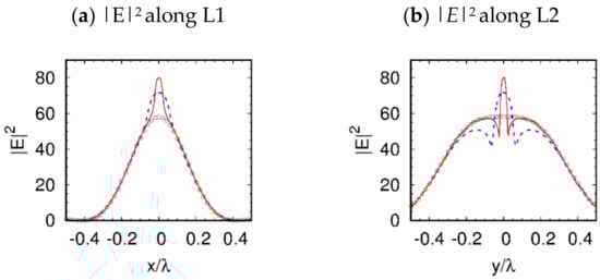 The effect of 3D-field localization inside and near the open boundary of a hole, which is clearly visible in Figure 3 and Figure 4, is similar to the horizontal slot wave-guide in 2D dimensions [18], as a result of this slot concentrating on the optical energy in the low refractive index region of the wave-guide [19]. It should be noticed that in Reference [18], the refractive index contrast was found to be more than 2. Moreover, in our case, the hole was surrounded by dielectric material with axial symmetry, and the boundaries of such a three-dimensional hole structure were essential for the field localization and enhancement, as is shown in Figure 3 and Figure 4. Furthermore, the high E-field confinement, and the large discontinuity in the air hole, is clearly visible in Figure 5. The E-field confinement in the air hole is dictated by the dielectric refractive index contrast [18,19]. It must be mentioned that, in our case, unlike the slot-wave-guides, the field became localized only near the shadow surface of the particle and not along the entire hole. The observed field enhancement effect was analogous to the lens effect. This allowed us to choose the length of the hole, which was not necessary to be equal to the diameter of the particle, but only a part of it (not the through hole). For example, this could be the length of the field localization region inside the particle, near the shadow surface.
