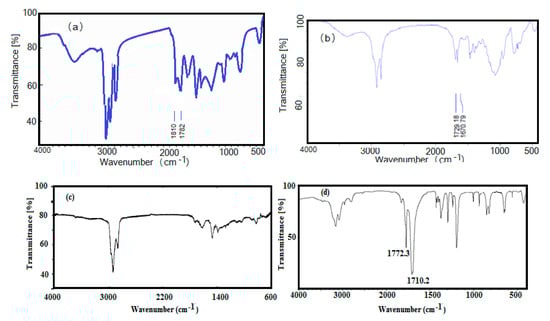 FTIR spectra of (a) Asphaltene-maleic anhydride, (b) ASAS, (c) asphaltene, and (d) succinimide.