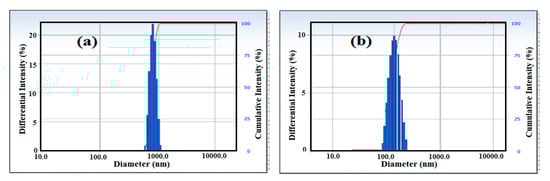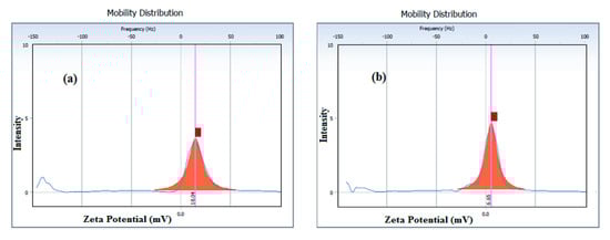 The particle sizes and surface charges (zeta potential; mV) determined via DLS measurements are presented in Figure 5 and Figure 6a,b.