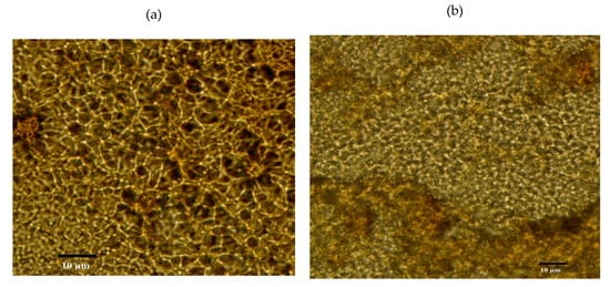 Scanning electron micrographs (SEM) and optical micrographs of the hydrophobic surfaces of HSNP-1 and HSNP-2 are presented in Figure 7 and Figure 8a,b, respectively.